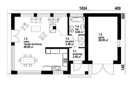 - parter: salon + aneks kuchenny, łazienka, garaż, korytarz, wiatrołap (możliwość wydzielenia dodatkowej sypialni);