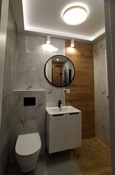 Mieszkanie jest w stanie idealnym. Po wykończeniu nie było zamieszkane. Sufity oraz ściany pokryte gładzią, malowane (część ścian dodatkowo pokryta tapetami). Na podłogach wysokiej klasy panele. Łazienka z kabiną prysznicową, szafka z umywalką, podwieszane wc.