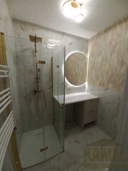 Mieszkanie jest całkiem nowe, nieużytkowane. Ściany oraz sufity pokryte gładzią gipsową, malowane. Na podłodze wysokiej klasy panele. Łazienka wykafelkowana, z kabiną prysznicową.