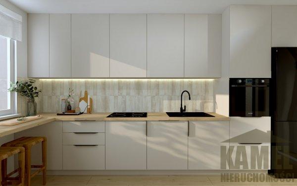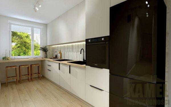W cenę wliczono nowe, wykonane na wymiar meble kuchenne ze sprzętem AGD (lodówka z zamrażarką, piekarnik, płyta gazowa, pochłaniacz, zmywarka).