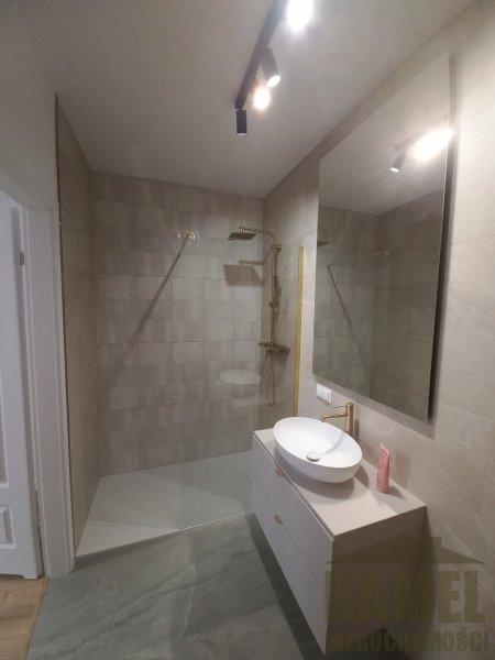 Mieszkanie jest całkiem nowe, nieużytkowane. Ściany oraz sufity pokryte gładzią gipsową, malowane. Na podłodze wysokiej klasy panele. Łazienka wykafelkowana, z kabiną prysznicową.